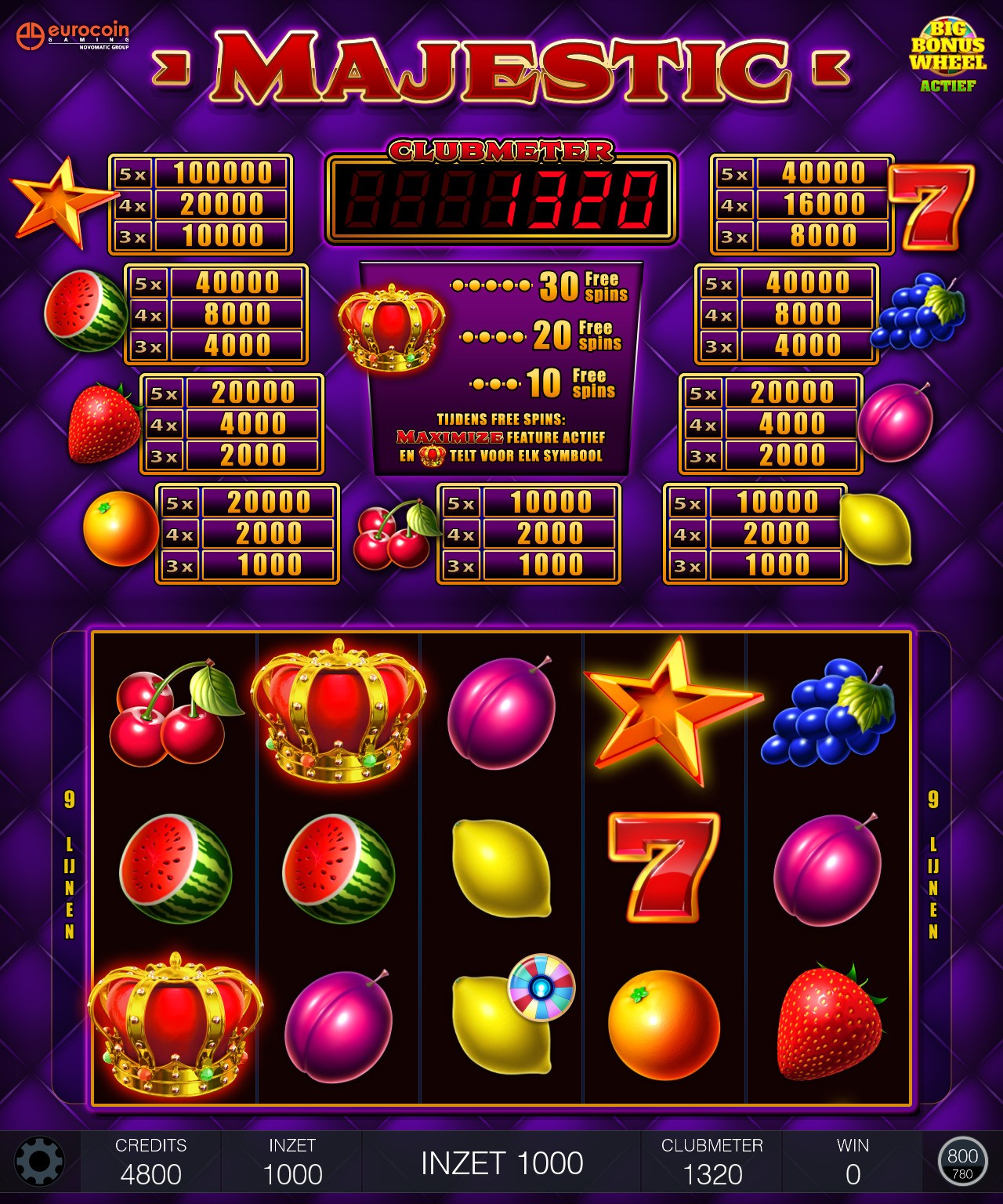 Elke combinatie van 3 of meer aaneengesloten gelijke symbolen op winlijn geeft prijs. Free Spins met Kroon Wild en Maximize feature. Maximize: Elke prijs verhoogt de betreffende winplan waarde voor een volgende hogere prijs.